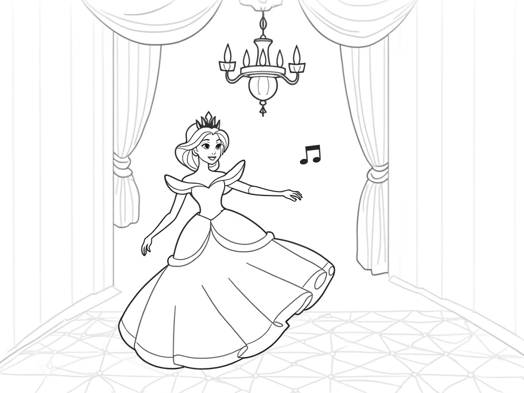A princess twirls in a grand ballroom with a layered gown, a tall chandelier, and music notes floating around. Black-and-white A4 coloring page with clean thick lines, patterned floor tiles and curtains, no shading, open areas for easy coloring.