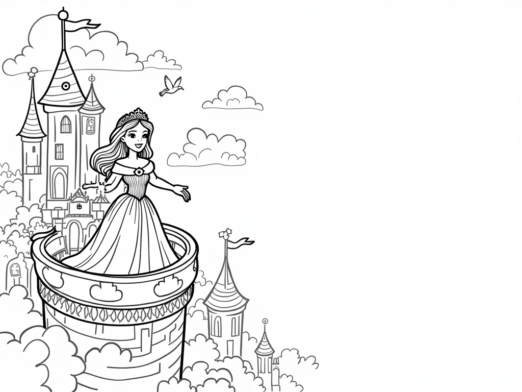 A smiling princess stands on a high castle balcony in a flowing gown and tiara, with flags, birds, and distant rooftops behind her. Black-and-white A4 coloring page with bold clean outlines, patterned clouds and banners, no shading, wide open areas for easy coloring.