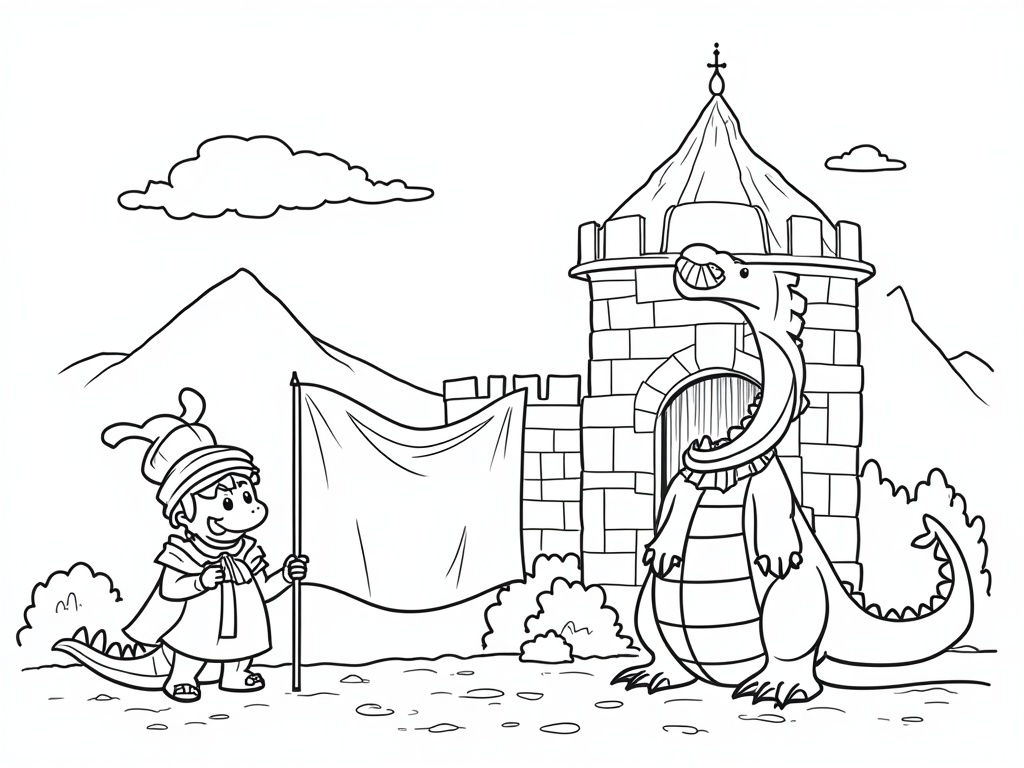 A brave princess stands beside a smiling dragon outside a stone keep, holding a banner while mountains and trees frame the scene. Black-and-white A4 coloring page with bold outlines, brick and scale textures, no shading, lots of open spaces.