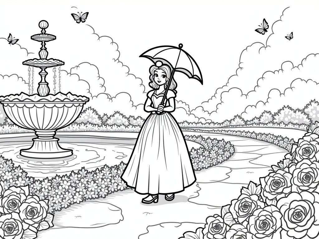 A princess walks along a palace garden path among roses, butterflies, and a decorative fountain, holding a parasol. Black-and-white A4 coloring page with thick outlines, simple floral patterns and hedges, no grayscale, large spaces for crayons.