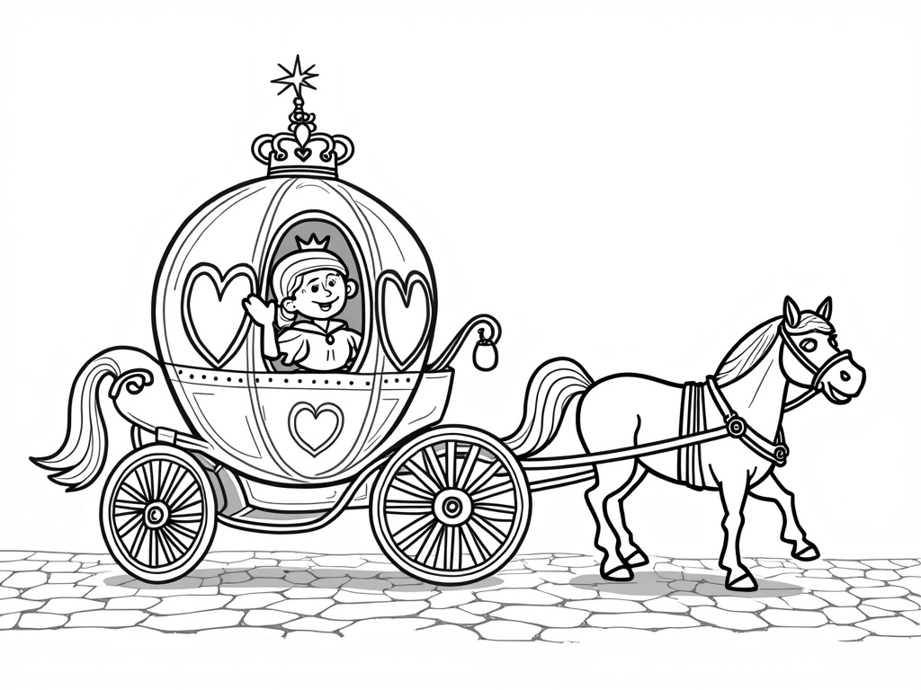 A princess waves from an ornate royal carriage with heart-shaped windows, pulled by a gentle horse past castle gates on a cobblestone road. Black-and-white A4 coloring page with bold outlines, star and crown border accents, no shading, clear sections for coloring.