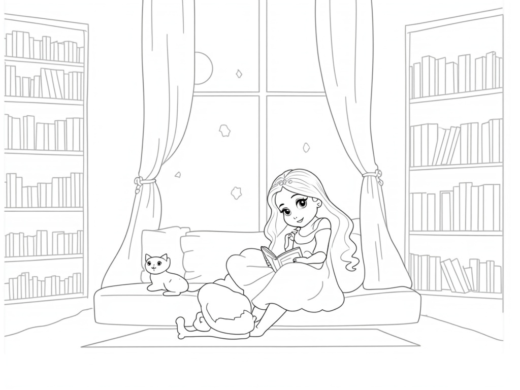 A thoughtful princess reads a book on a cushioned window seat surrounded by tall bookshelves, a cat curled at her feet, and moon and stars outside. Black-and-white A4 coloring page with clear outlines, simple rug and curtain patterns, no shading, generous coloring areas.