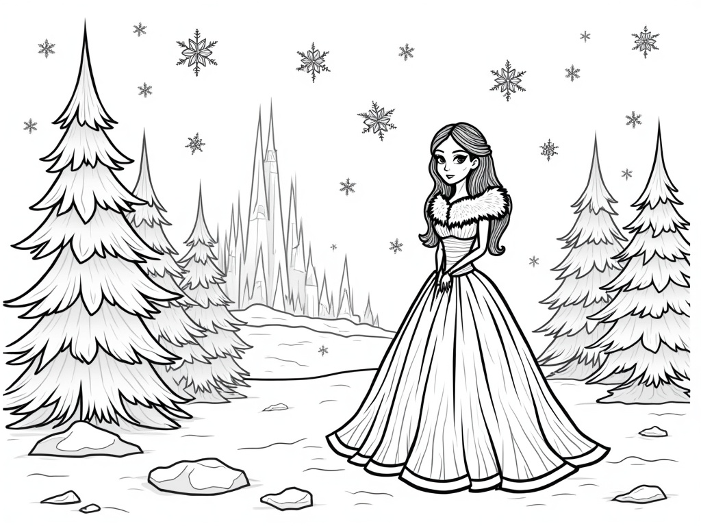 A winter princess in a fur-trimmed gown stands among pine trees and giant snowflake patterns, with an ice castle silhouette in the distance. Black-and-white A4 coloring page with thick lines, decorative borders, no shading, plenty of open spaces.
