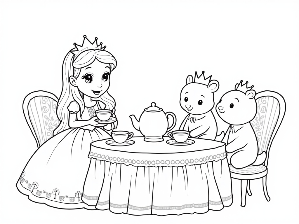 A princess hosts a tea party at a lace-topped table with a teapot, cupcakes, and friendly animal guests wearing tiny crowns. Black-and-white A4 coloring page with bold outlines, simple wallpaper patterns and bunting, no shading, big colorable shapes.