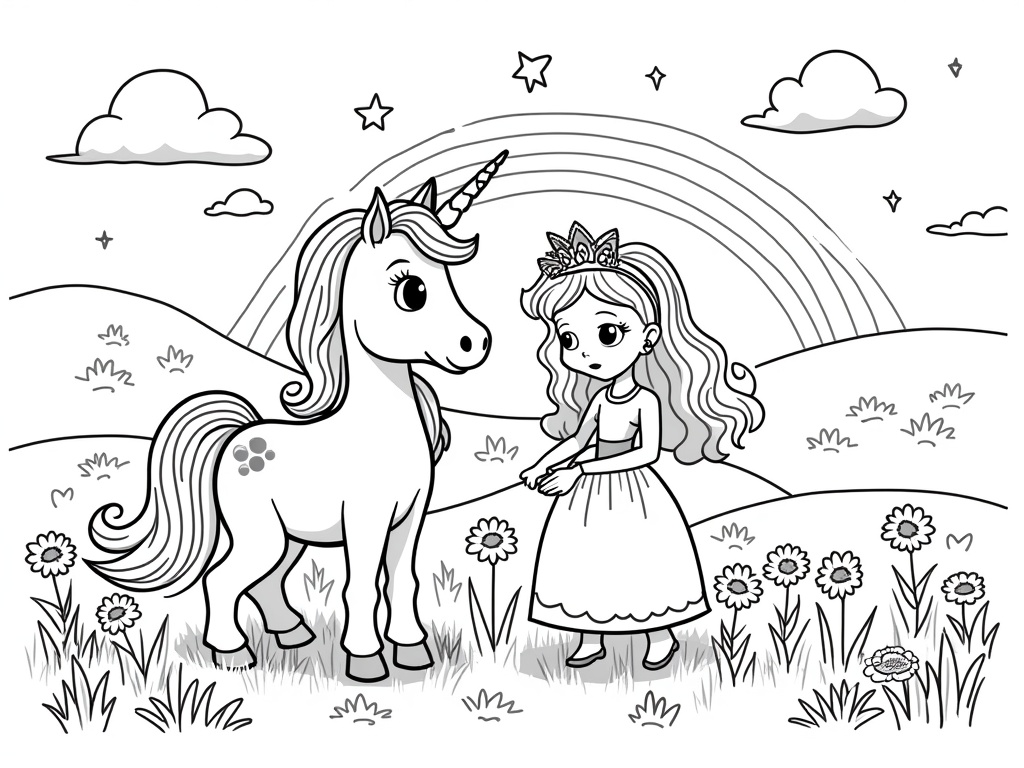 A princess pets a unicorn in a meadow of daisies with rolling hills, a rainbow outline, and fluffy clouds. Black-and-white A4 coloring page with thick lines, star and heart motifs, no grayscale, spacious areas for coloring.