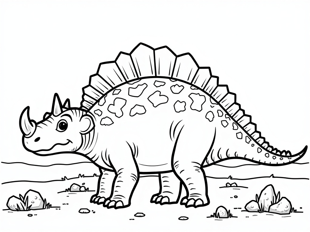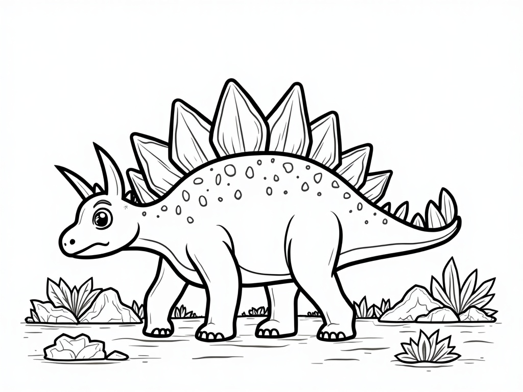A cheerful Stegosaurus walks slowly with big rounded back plates and a swishy tail. Rocks, ferns, and a distant volcano add interest while keeping bold black-and-white A4 line art, thick contours, and easy-to-fill shapes.