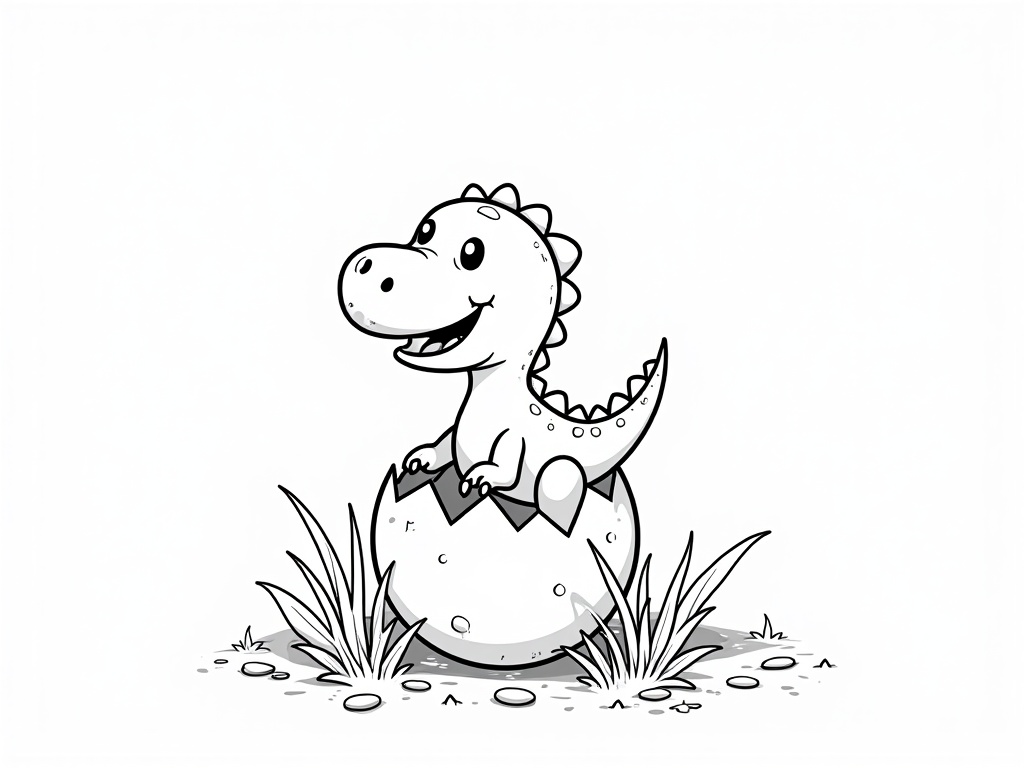 A baby dinosaur pops out of a cracked egg with a big smile, tiny claws, and speckled shell pieces around. A cozy nest, leaves, and a simple sky complete the black-and-white A4 page with thick lines and generous open spaces.