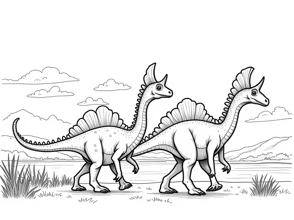 A pair of Parasaurolophus dinosaurs stroll in profile, showing their tall head crests. Grassy tufts, reeds by a pond, and distant hills are rendered in bold black-and-white A4 outlines with wide, easy areas to color.