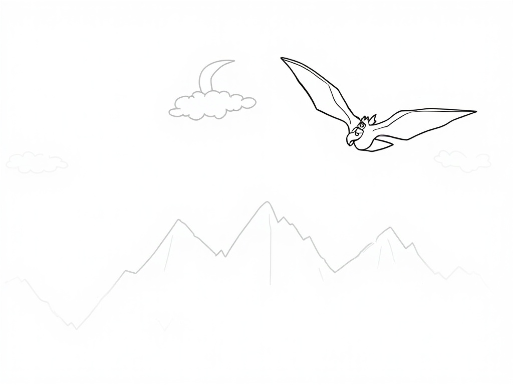 A happy Pterodactyl glides across the sky with wide wings and a smooth beak. Big clouds, a crescent moon, and tiny mountains below make a playful scene in black-and-white A4 line art with thick outlines and minimal detail.