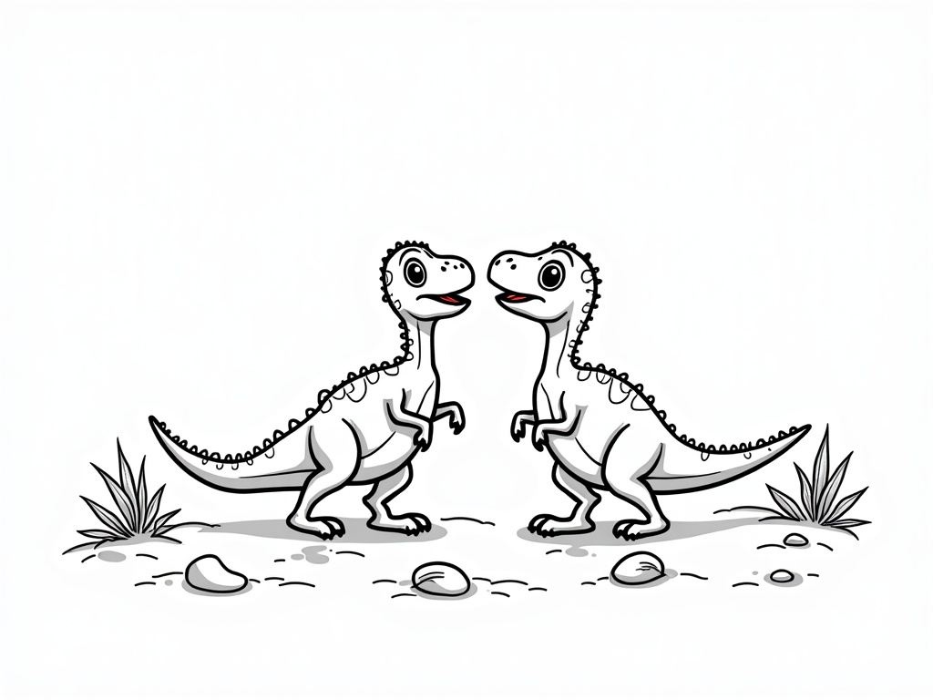 Two cute Velociraptors walk side by side with friendly expressions and small curved claws. Footprints in sand, ferns, and a few eggshells decorate the ground in black-and-white A4 portrait line art with strong outlines and simple shapes.