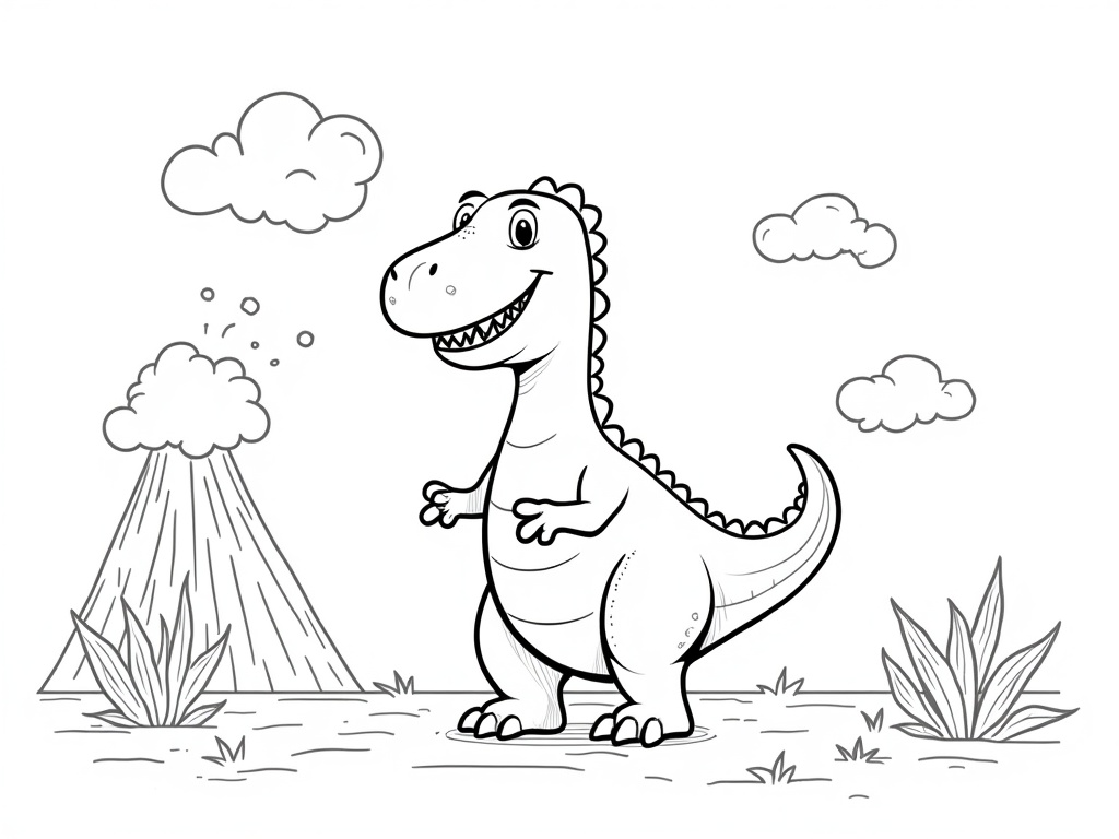 A friendly T-Rex stands in the center with a big grin, short arms up, and a chunky tail curving behind. A simple volcano, puffy clouds, and fern bushes frame the scene in black-and-white A4 portrait line art with bold outlines, no shading, and large open areas to color.