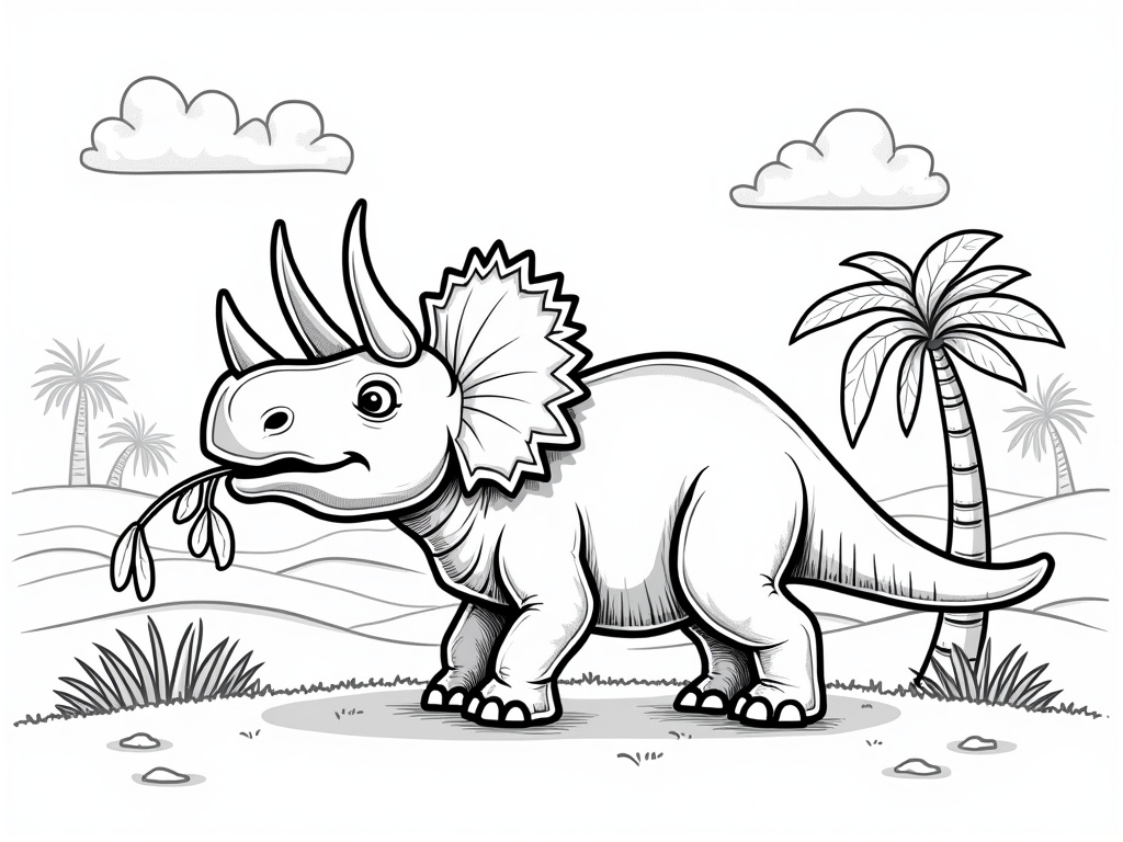A gentle Triceratops in side view munches a leafy branch, showing its three horns and frill. Rolling hills, simple flowers, and a few palm trees create a calm background in clean black-and-white A4 portrait outlines with wide spaces and minimal details.