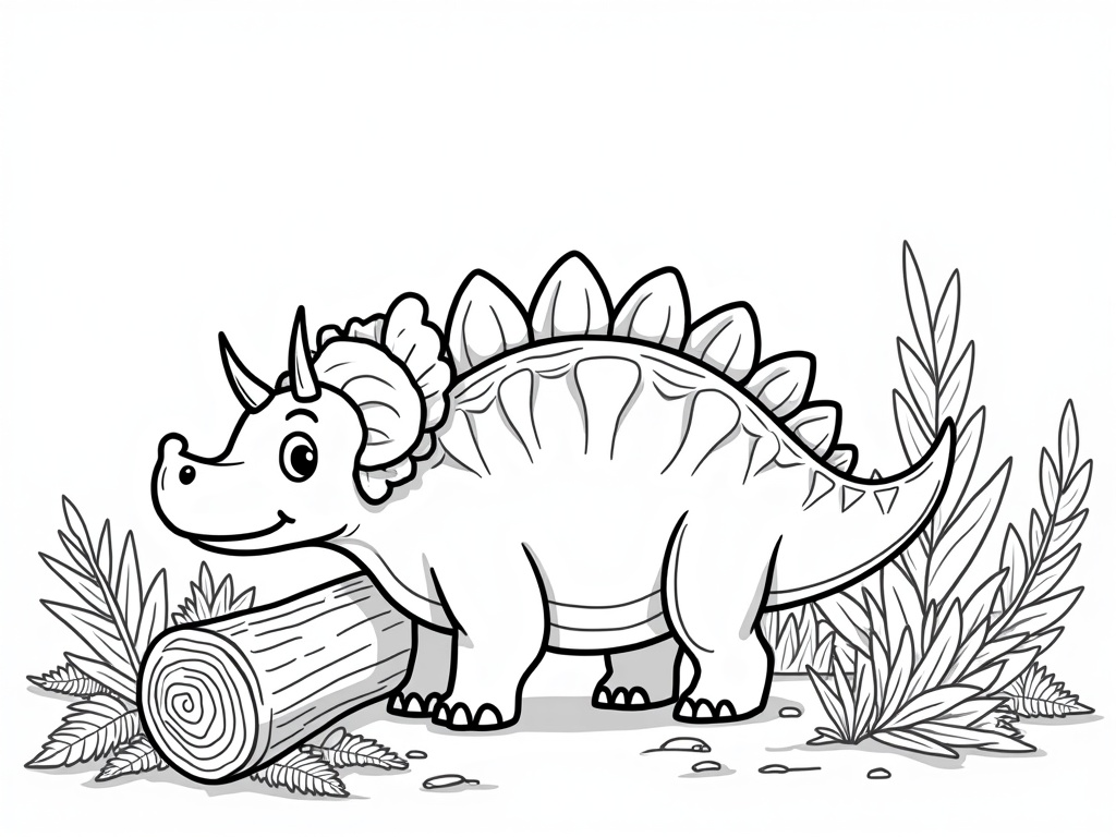 A cheerful ankylosaurus stands near ferns and a fallen log, tail club raised playfully. Strong outlines and simple textures with roomy shapes, easy A4 black-and-white coloring scene for kids.