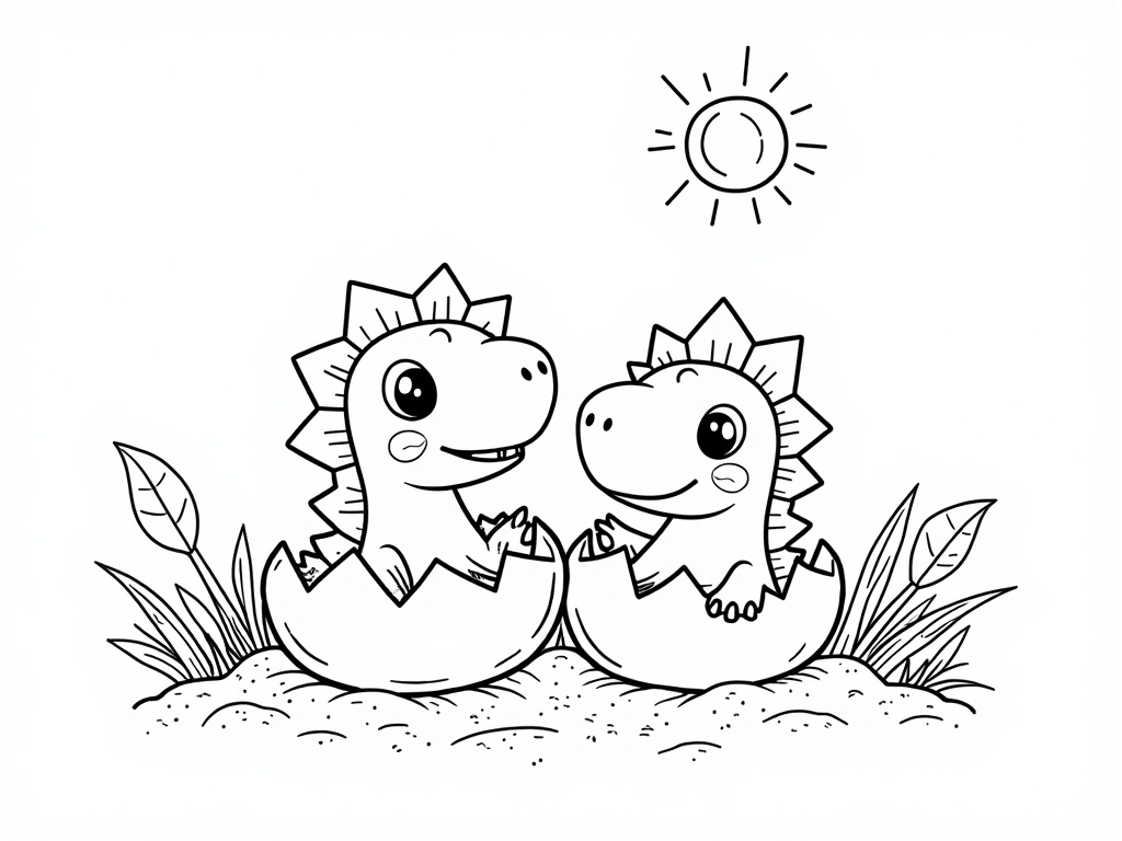 Two baby dinosaurs peek out of cracked eggs in a sandy nest, with a few big leaves and a sun overhead. Cute rounded shapes, bold outlines, and generous white spaces for easy coloring on an A4 page.