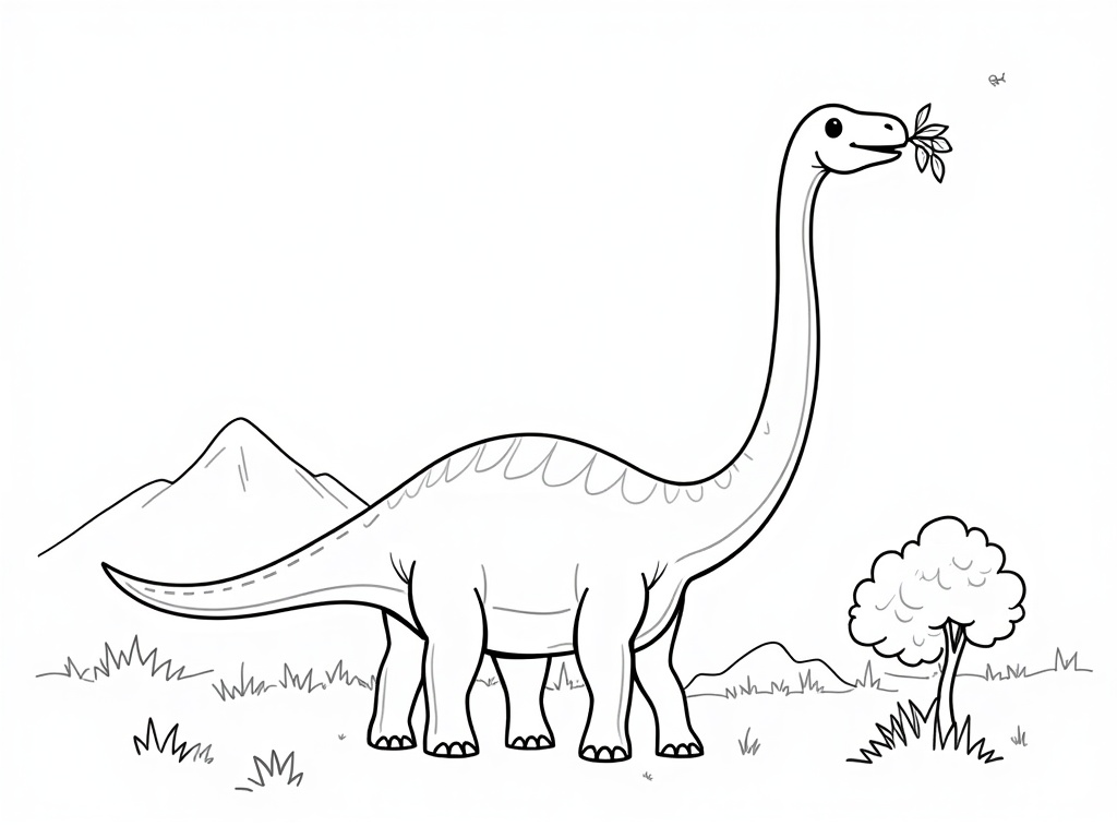 A tall brachiosaurus stretches its neck to nibble leaves from a tree, with small mountains and big clouds behind. Clean bold outlines, minimal clutter, and large color zones on an A4 kids coloring page.