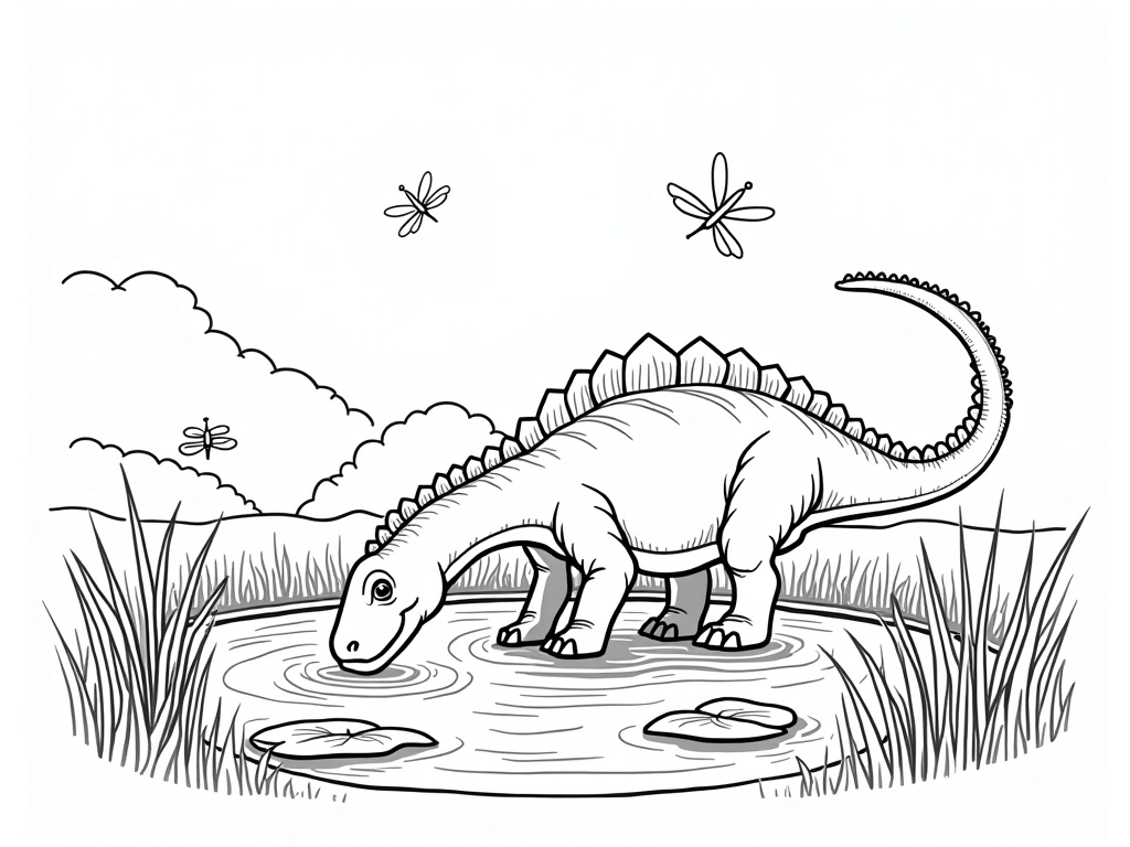 A parasaurolophus drinks at a calm pond with lily pads and reeds, while dragonflies hover above. Clean chunky outlines, simple shapes, and wide open areas perfect for young colorists on A4.