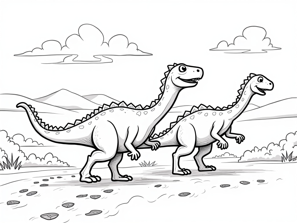 Two friendly velociraptors trot side by side on a trail, leaving big footprints behind them. Smooth simple lines, smiling faces, and an open landscape with hills and clouds, A4 black-and-white line art for kids.