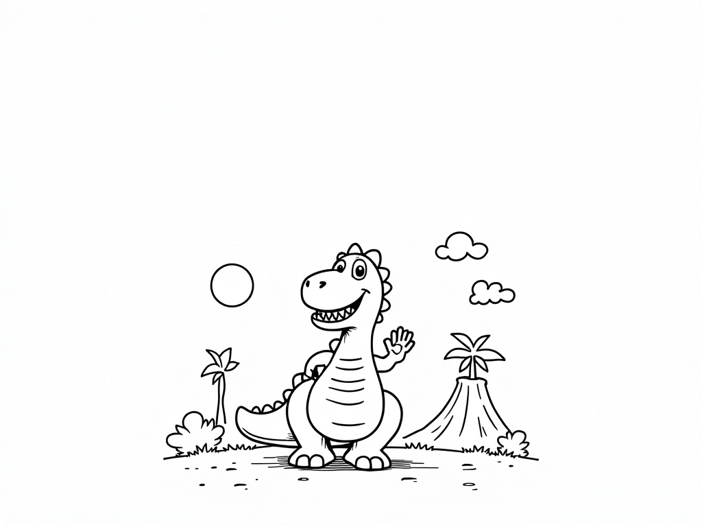 A friendly T-Rex stands on a grassy plain with a small volcano and palm trees in the distance, waving a tiny arm. Bold, clean outlines and large simple shapes, black-and-white line art for kids on A4, with clouds and a sun to color.