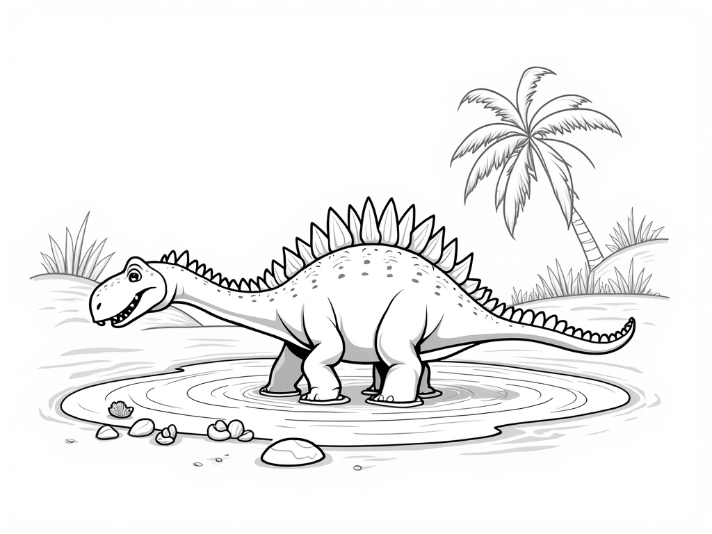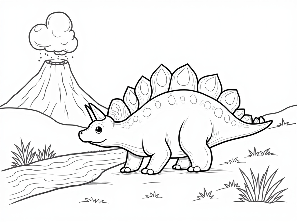 A stegosaurus with rounded plates walks along a path beside a stream, while a volcano puffs a tiny cloud in the background. Simple kid-friendly shapes with thick outlines and wide areas to color, black-and-white A4 line art.