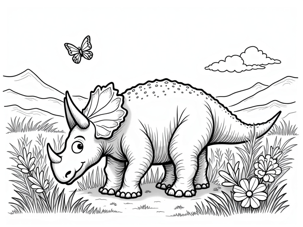 A gentle triceratops grazes among big flowers and ferns, with rolling hills and butterflies around. Easy contours, thick lines, minimal details, and plenty of open spaces for coloring on an A4 page.
