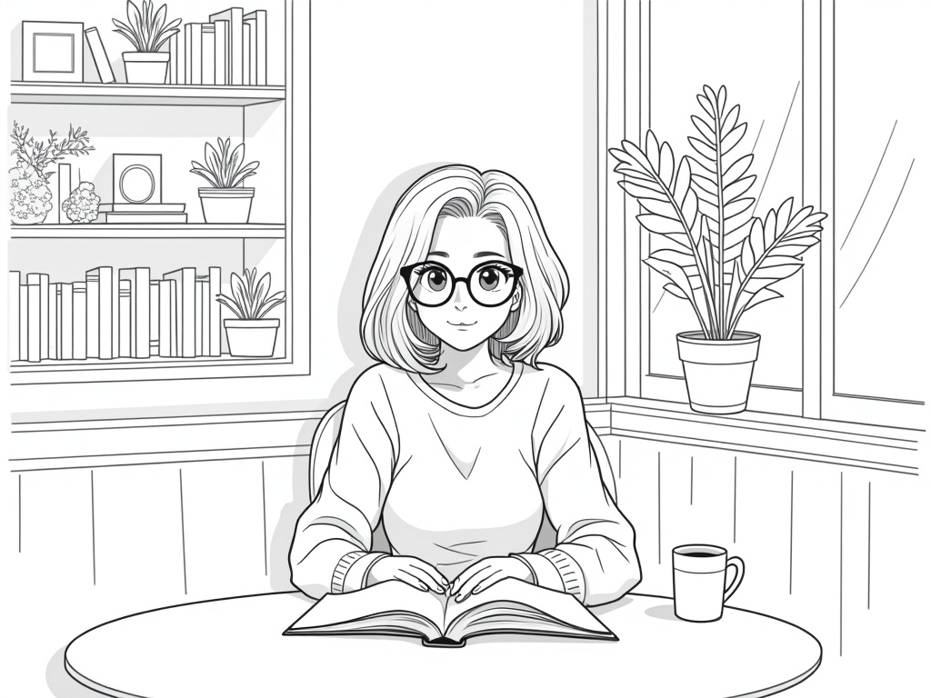 An adult anime-style woman reads a book at a cozy café table with a cup of cocoa, wearing round glasses. Shelves of books, potted plants, and a window scene add decorative details, all in crisp, printable coloring lines.