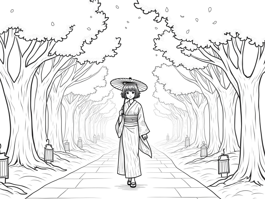 An adult anime-style woman in a flowing yukata walks under arching cherry blossom trees, holding a paper parasol and smiling. Petals drift around, with lanterns, a stone path, and patterned fabric details; clean black-and-white line art with thick outlines and lots of open spaces for coloring.