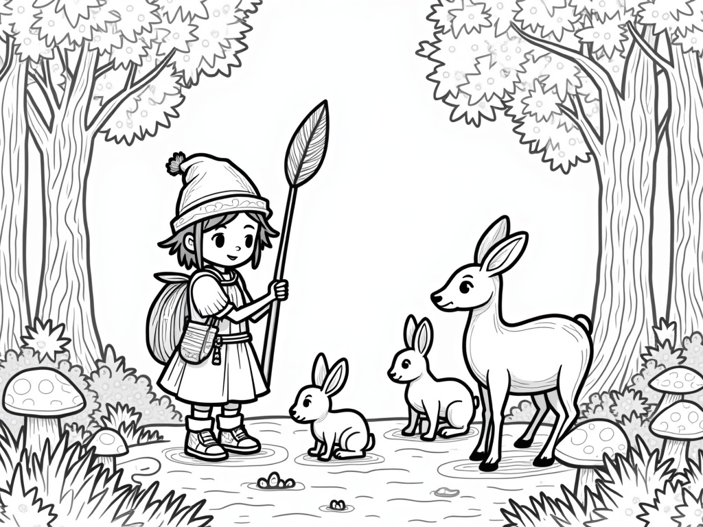 An adult anime-style wanderer holds a leafy staff while friendly deer and rabbits gather around in a forest clearing. Intricate foliage, mushrooms, and bark textures create patterns to color, drawn in bold, kid-friendly outlines.