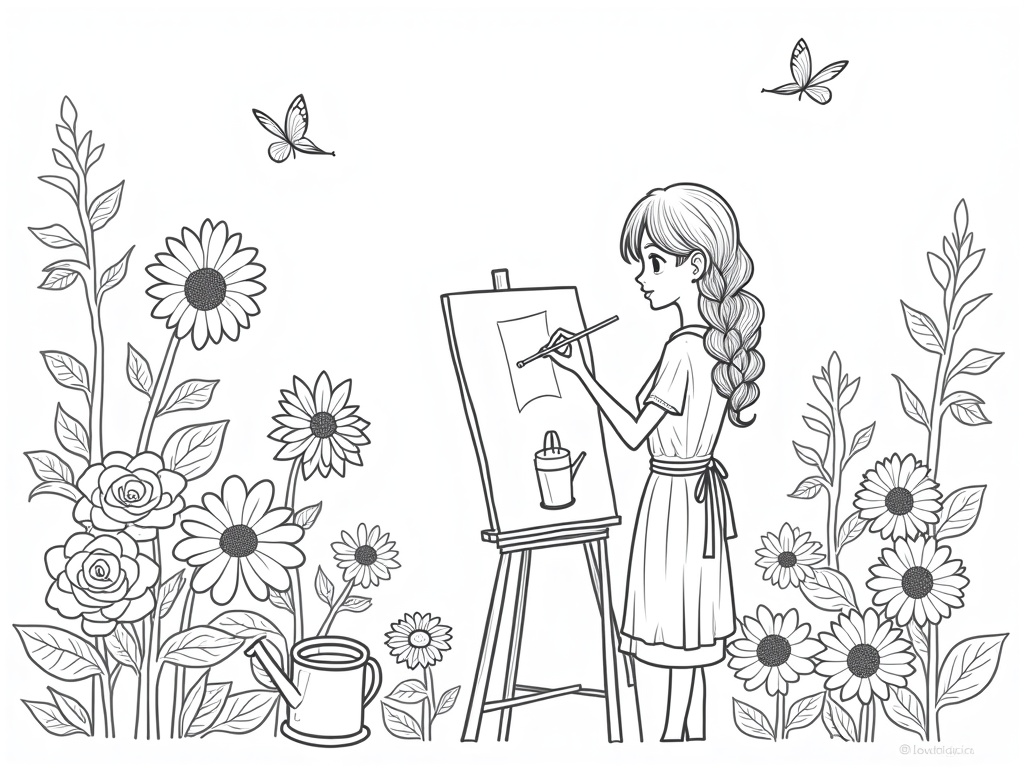 An adult anime-style artist stands at an easel painting flowers in a sunny garden, her braid and apron fluttering. Roses, sunflowers, watering cans, and butterfly accents offer many shapes to color, with thick outlines and no grayscale shading.