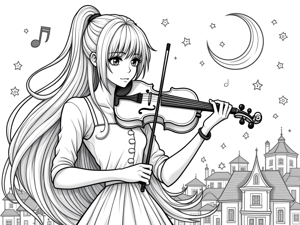 An adult anime-style heroine plays a violin while floating musical notes and swirls surround her long hair. City rooftops and a crescent moon in the background with star motifs, crisp coloring-book lines, no shading, and decorative borders to fill.