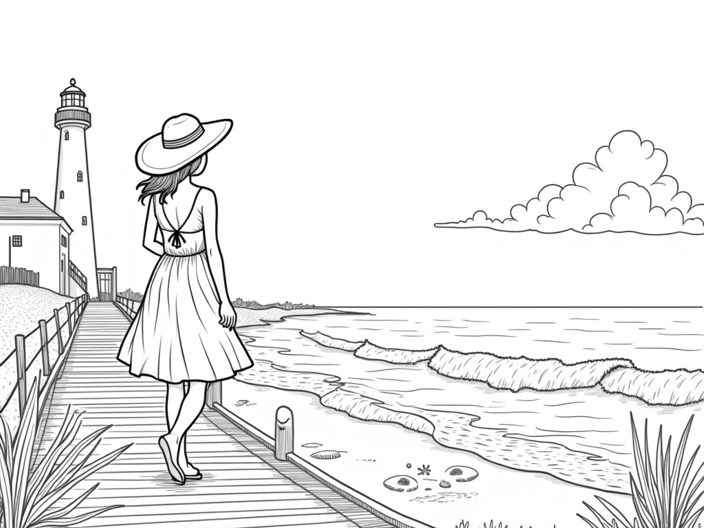 An adult anime-style woman in a light sundress stands on a pier with a wide-brim hat, waves curling below. Seashells, gulls, and a lighthouse frame the scene, using kid-friendly black-and-white line art with open areas to color.