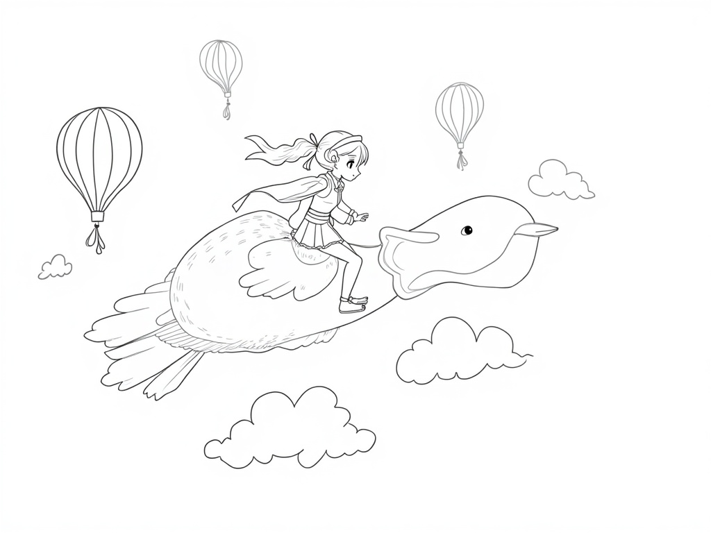 An adult anime-style adventurer rides a gentle, cartoonish giant bird through fluffy clouds, hair ribbons streaming. Balloons, kites, and layered cloud patterns surround them, designed as simple, bold linework for easy coloring.