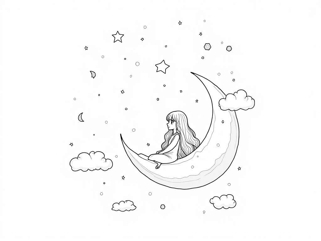 An adult anime-style woman sits on a crescent moon with long flowing hair and a gentle smile. Constellations, comets, and clouds fill the sky in simple patterns, with clean black ink outlines and plenty of negative space.