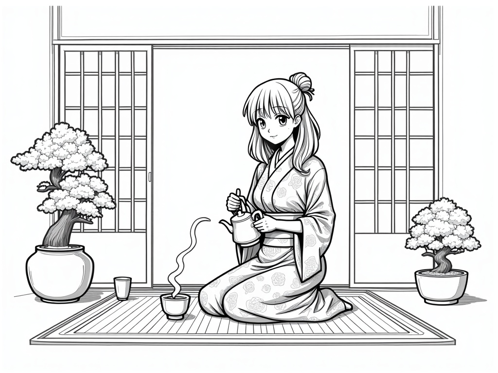 An adult anime-style woman kneels on tatami, pouring tea from a teapot into cups with steam curling upward. Sliding shoji doors, bonsai, and kimono patterns provide detailed areas to color, rendered in clear, high-contrast line art.