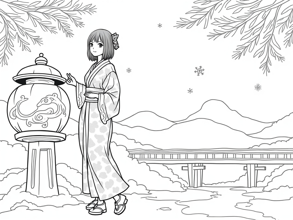 An adult anime-style woman in a patterned kimono stands beside a snow lantern with swirling winter wind motifs. Pine branches, snowflakes, and a bridge in the distance create calm scenery, drawn with clean, thick outlines for coloring.