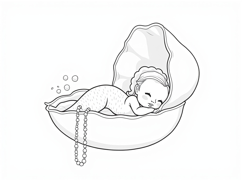 A baby mermaid sleeps in a big clam shell cradle, with a hanging string of pearls and soft drifting bubbles. Simple, rounded shapes and heavy outlines make an easy A4 black-and-white coloring design.