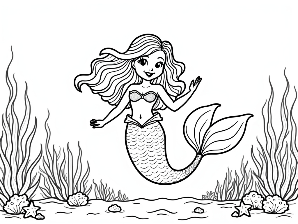 A joyful mermaid twirls in a coral garden with gently swaying seaweed and a couple of starfish at her tail. The scene uses bold outlines, clean negative space, and simple patterns for an easy A4 black-and-white printable.