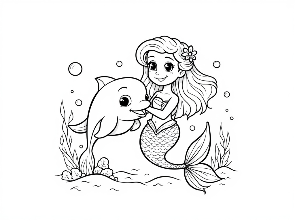 A friendly mermaid holds fins with a smiling dolphin while bubbles rise and simple coral shapes frame the scene. Thick black outlines, easy shapes, and plenty of open water areas fill an A4 portrait coloring page.