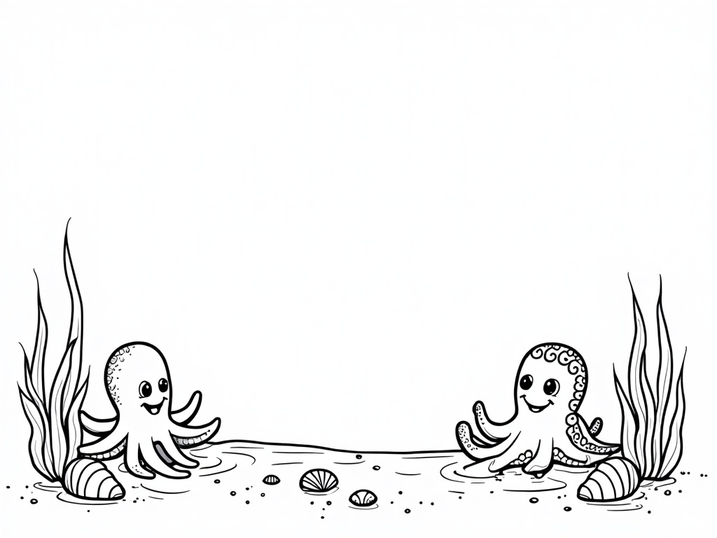 A cheerful mermaid plays pat-a-cake with a cute octopus, while sea grass and shells form a simple border. Bold black outlines and roomy shapes are arranged for clean A4 portrait printing.