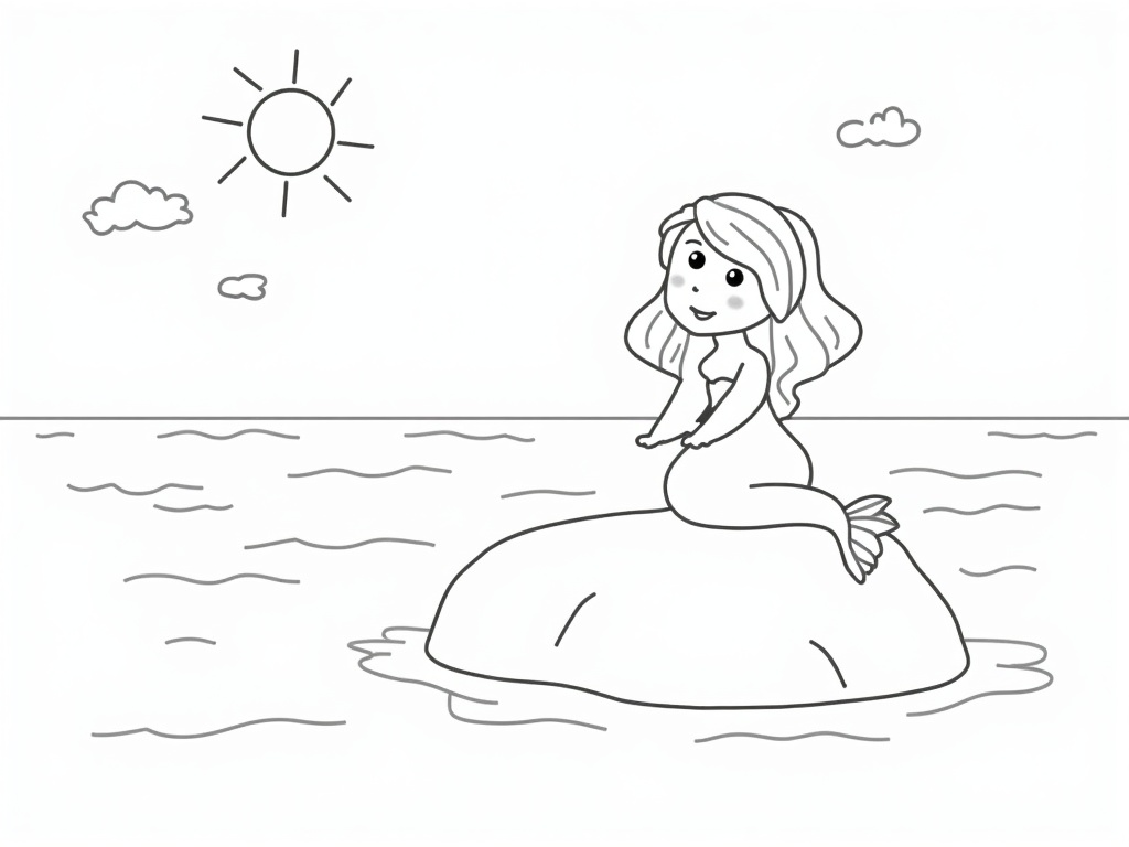 A cute mermaid sits on a smooth rock near gentle waves, with a big sun and a few clouds above the horizon. Bold, simple outlines and minimal details make wide spaces for coloring on an A4 black-and-white page.