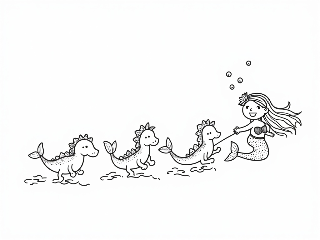 A mermaid leads three tiny seahorses in a playful parade, each with a small bow, as bubbles float upward. Minimal detail, thick line art, and large coloring spaces suit an A4 black-and-white page.