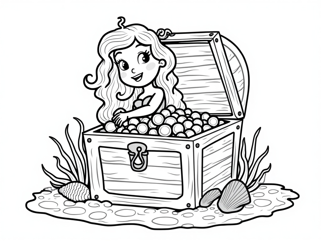 A mermaid opens a large treasure chest filled with big pearls and coins, with seashells and sand around her. Clear, chunky lines and uncomplicated shapes create a cute black-and-white A4 coloring page.