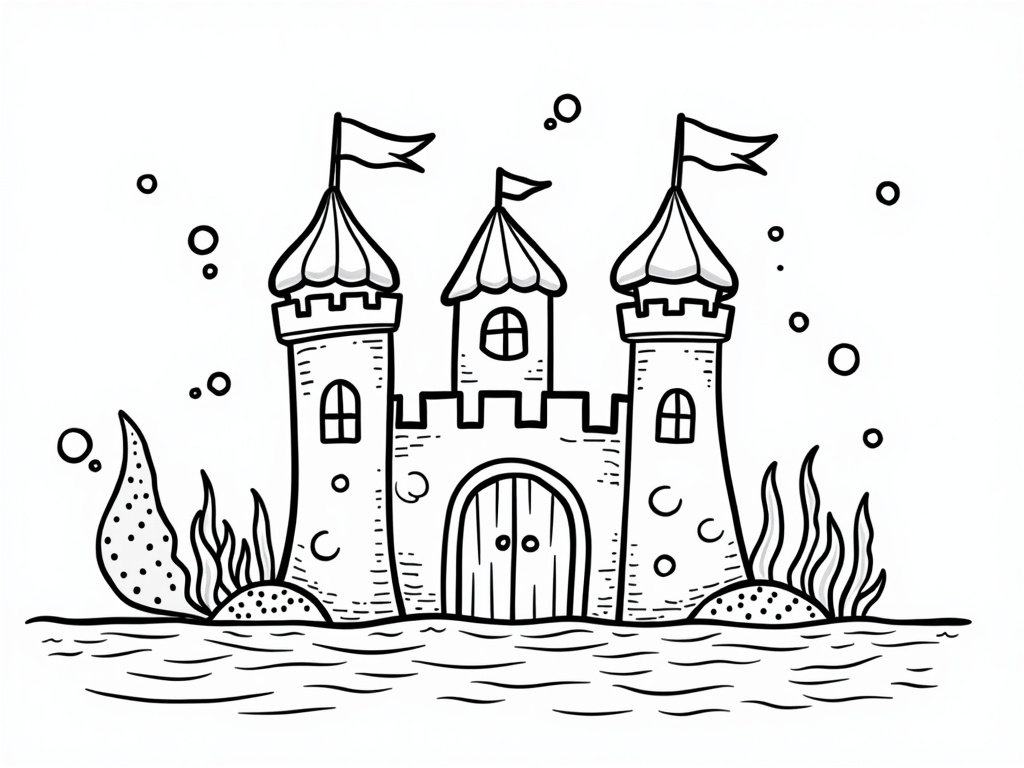A mermaid waves in front of a simple shell-topped undersea castle with two towers and a flag, surrounded by bubbles. Strong outlines and minimal details leave big spaces to color on an A4 black-and-white printable.
