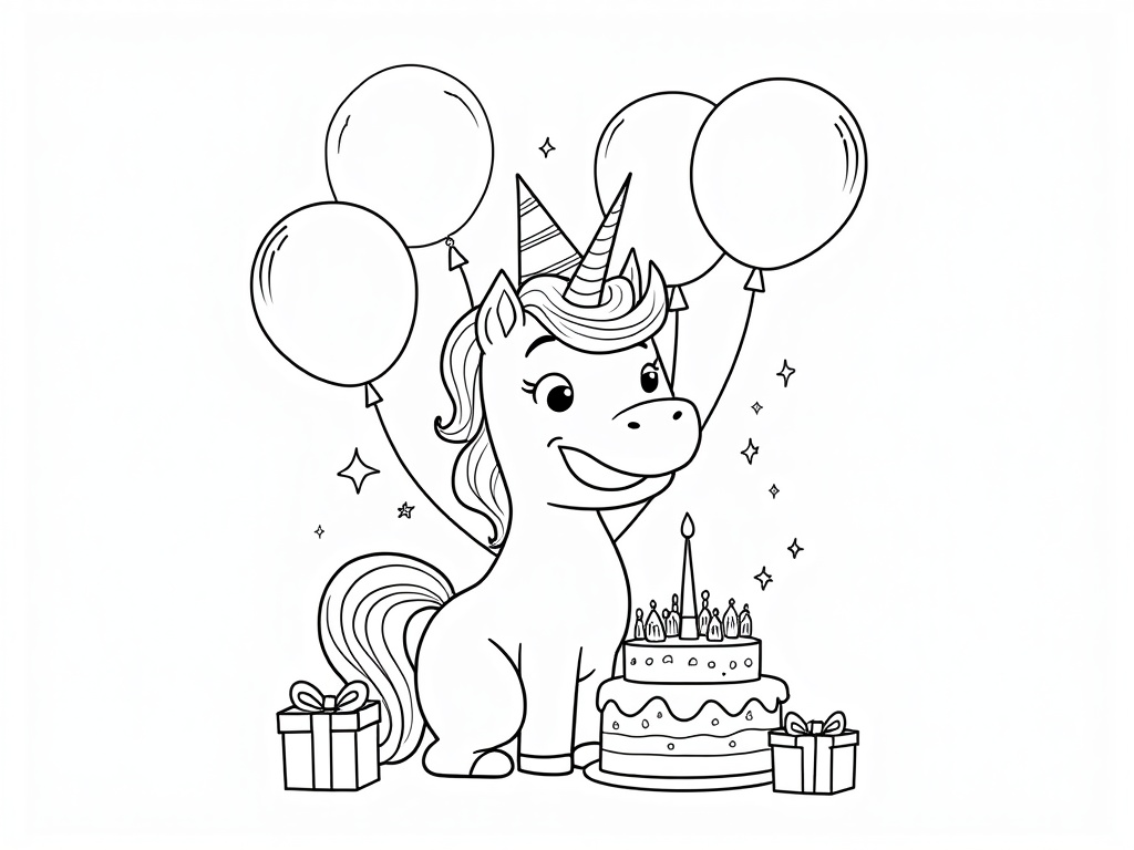 A smiling unicorn wears a party hat beside balloons, a big cake, confetti, and gift boxes. A4 portrait black-and-white line art with kid-safe, thick outlines and broad shapes, no shading.