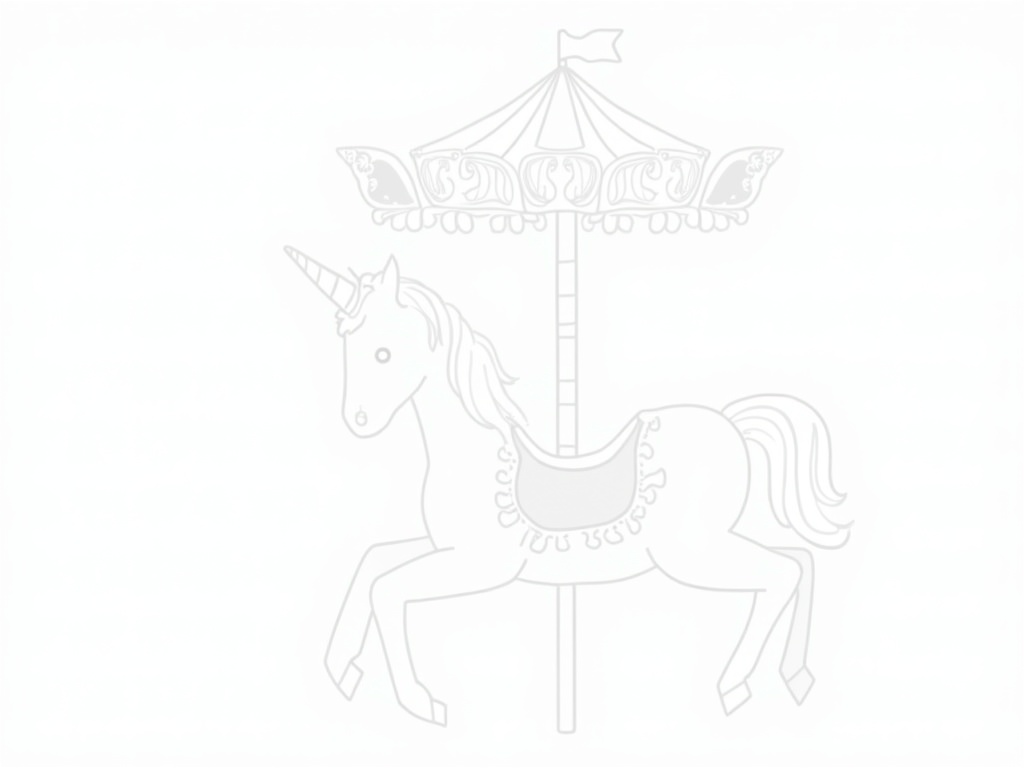 A carousel unicorn with a decorative saddle and pole stands under a striped canopy with ribbons. Crisp A4 black-and-white line art with bold contours, simple patterns, and generous blank areas.