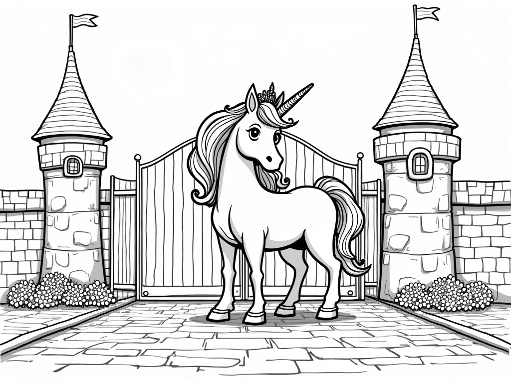 A royal unicorn stands by a fairy-tale castle gate with banners, cobblestones, and potted flowers. Clean black-and-white A4 line art with bold contours and large coloring areas, kid-friendly and free of any grayscale.