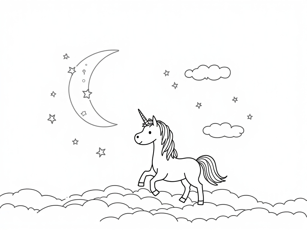 A unicorn marches on layered clouds with dangling star garlands and a crescent moon in the sky. Kid-friendly A4 black-and-white line art with chunky outlines and wide open areas, no gray tones.