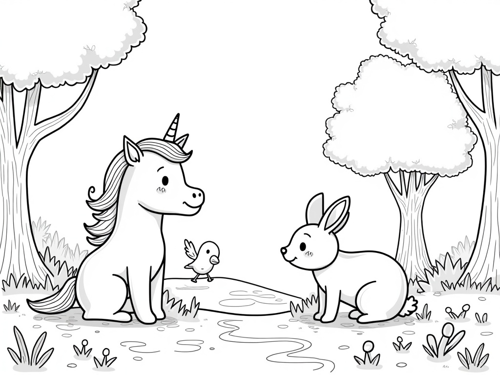 A gentle unicorn meets a bunny, a deer, and birds among trees, mushrooms, and a winding path. High-contrast A4 line art in black-and-white with thick outlines and uncluttered spaces for coloring.