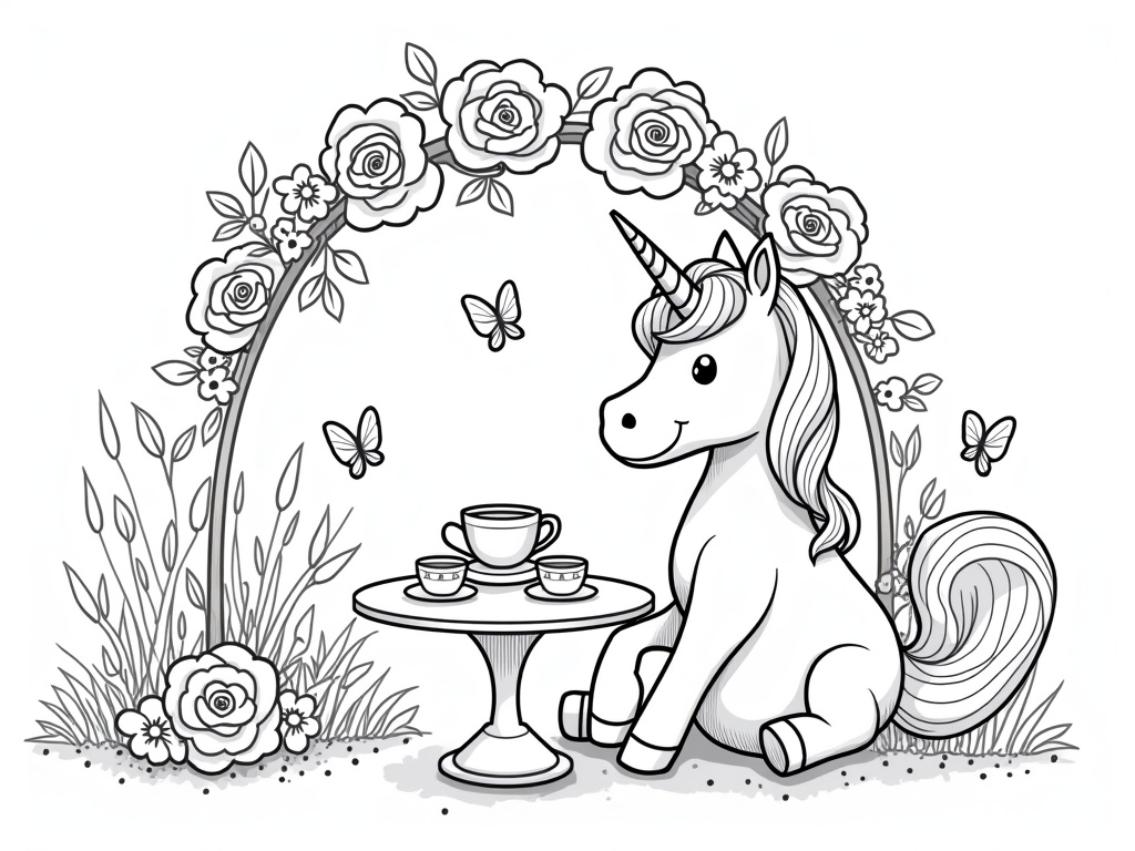 A unicorn sits by a tiny tea table with teacups, butterflies, and blooming roses on a garden arch. Black-and-white A4 line art with thick lines, simple decorative details, and plenty of blank areas.