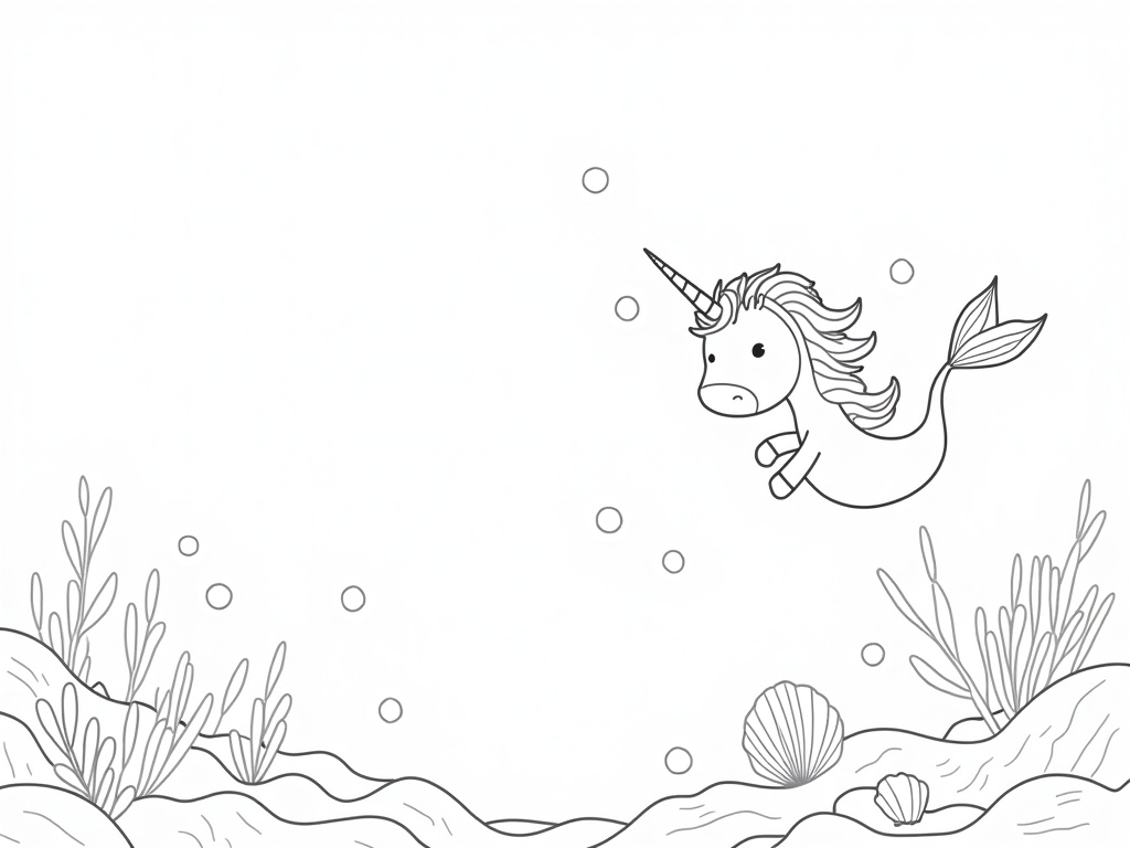 A magical mer-unicorn glides above coral, seashells, and friendly fish bubbles in an underwater scene. Simple black-and-white A4 portrait line art with bold outlines, clear negative space, and no shading.