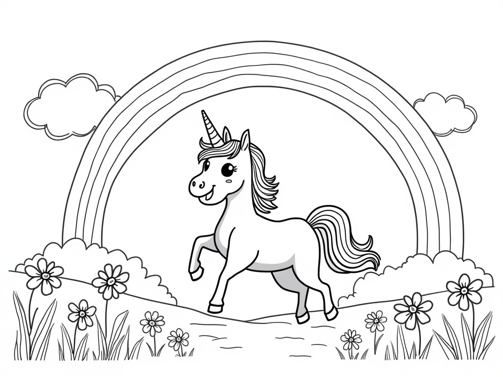 A cheerful unicorn prances in a flower meadow beneath a big arched rainbow with fluffy clouds. Black-and-white A4 portrait line art with thick outlines, simple shapes, and plenty of open spaces; no shading or gray.